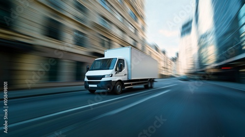 speeding delivery vehicle, white cab and trailer, motion-streaked surroundings, low angle view, industrial logistics concept, daylight urban setting