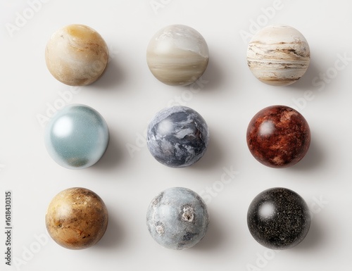 sphere, collection, marble, stone, texture, polished, smooth, round, decorative, natural, design, geometric, modern, abstract, colours, variety, pattern, visual, element, unique, background, white, top, view, flat, material, realistic, three-dimensional, rendering, illustration, ceramic, gemstone, object, interior, home, style, elegant, luxurious, sophisticated, composition, symmetry, aesthetic, impact
