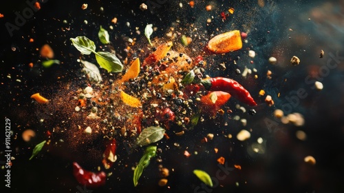 spices exploding in the air on a dark background.capturing dynamic motion and energetic spirit of culinary art