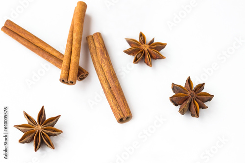 Spices: star anise and cinnamon sticks on white background. Close up.