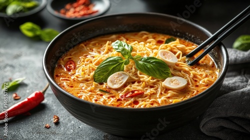 Spicy Asian style instant ramen noodle soup with fresh basil and boiled eggs in a black bowl on dark background perfect for food photography and culinary dishes