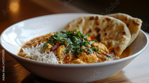 Spicy Chicken Curry with Naan and Rice in a White Bowl