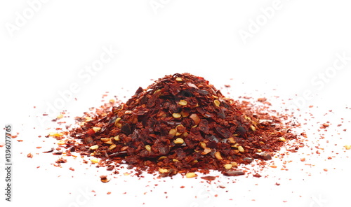 Spicy chili red pepper flakes, chopped, milled dry paprika pile isolated on white, side view