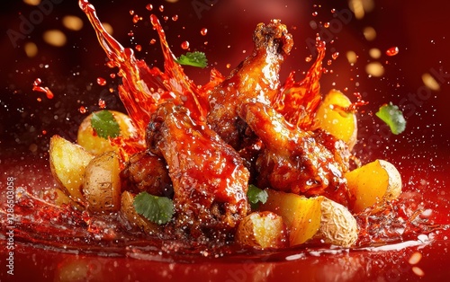 Spicy fried chicken wings with hot sauce splashes and potato wedges on a fiery red background