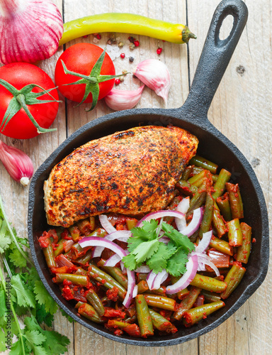 Spicy green beans with tomatoes,onions, cilantro and roasted the meat in the pan