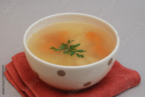 Spicy homemade soup served in pottery bowl with orange napkin on gray background