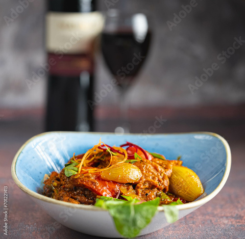 Spicy Indian chicken curry with tomato.
