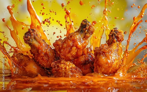 Spicy mango habanero fried chicken wings in a vibrant sauce splash, exotic and tropical composition