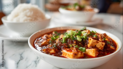 Spicy mapo tofu served with steamed rice.