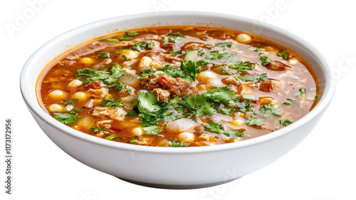 Spicy meatball soup with herbs served in a white bowl on a transparent background, ready for a hearty meal.