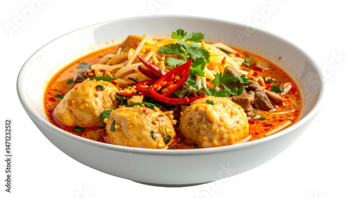 Spicy Meatball Soup with Noodles, Cilantro, and Chili Peppers; Transparent Background