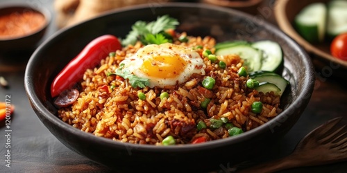 Spicy Nasi Goreng in a dark bowl with egg, cucumbers, and red chili, garnished with cilantro on wooden table with spices.