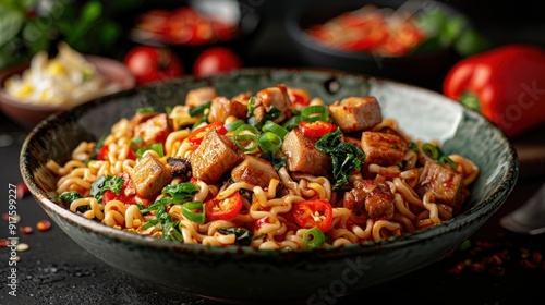 noodle, meat, vegetable, spicey, dish, food, cookery, cooking, meal, dinner, lunch, tasty, delicious, appetising, flavorful, savoury, red, green, orange, bowl, plate, pepper, tomatoes, onion, fresh, hot, asian, chinese, japanese, korean, thai, vietnamese, epicure, culinary, gastronomy, oriental, snack, ingredient