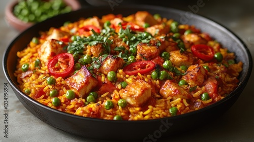 Spicy paneer rice dish in pan, garnished with cilantro, peppers, and peas