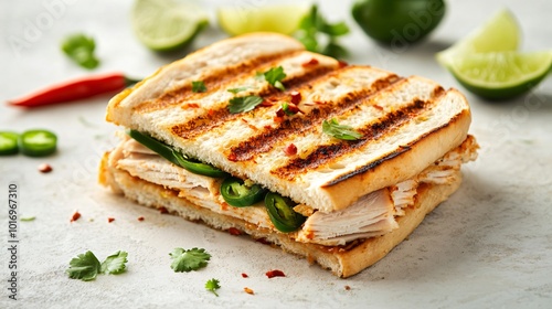 Spicy panini filled with turkey and jalapeños, isolated on a light stone background with chili peppers and lime wedges
