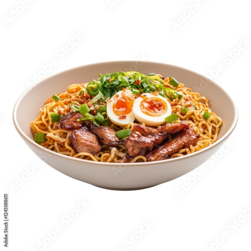 Spicy Pork Noodles: A delectable bowl of ramen noodles topped with savory, succulent pork, sliced eggs, and fresh green onions.