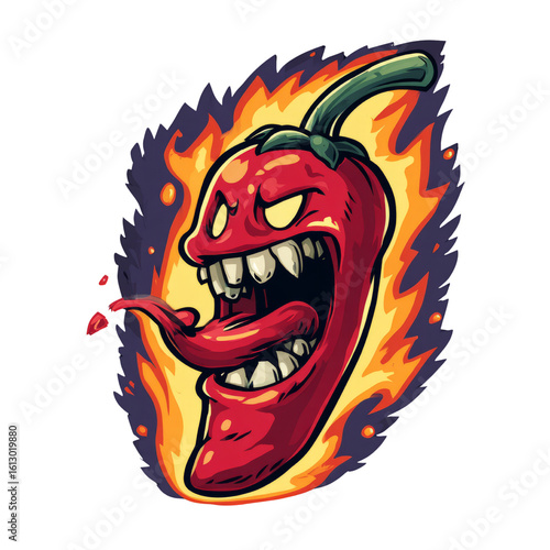 Spicy Rage: Fiery Cartoon Chili Pepper with Sharp Teeth and Furious Flames