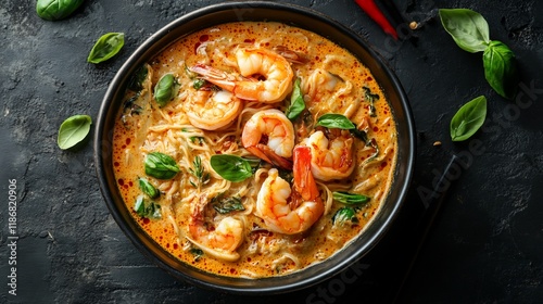 soup, shrimp, noodle, spicey, red, curry, thai, asian, food, dish, meal, dinner, lunch, prawn, seafood, pasta, coconut, milk, chili, pepper, basil, vegetable, garnish, delicious, tasty, healthy, hot, aromatic, vibrant, appetising, cookery, cooking, eatery, eat, plate, bowl, dark, background, overhead, top, view, photo
