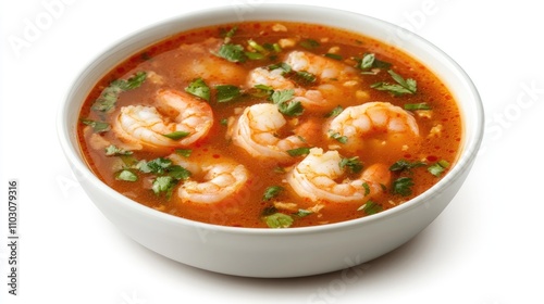 Spicy shrimp soup showcasing plump shrimp in a rich, aromatic broth, garnished with fresh herbs, against a clean white background.