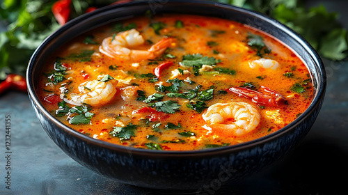 Spicy Shrimp Soup with Herbs and Chili Peppers Served in a Bowl on a Dark Background