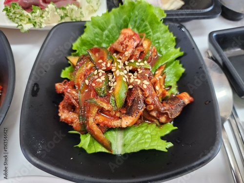 plate, spicey, seafood, traditional, fried, stir, korean, korea, octopus, tasty, background, dish, meal, dinner, delicious, cookery, eatery, epicure, lunch, korean food, fresh, healthy, food, cooking, white, red, vegetable, sauce, pepper, favourite, mollusca, cafes, noodle