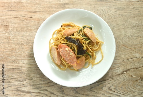 spicy stir fried spaghetti slice pork sausage with dry chili and basil leaf on plate