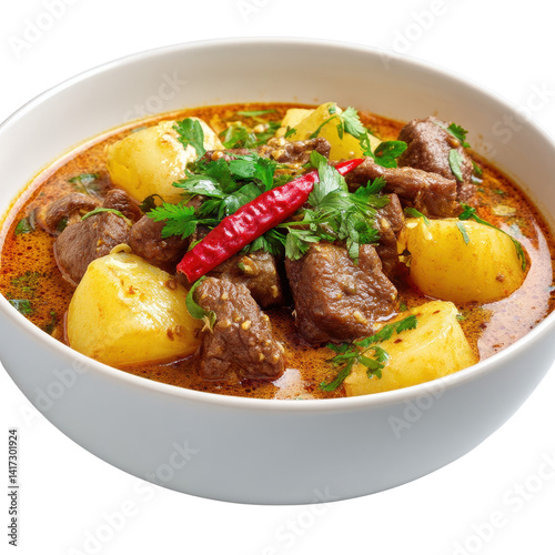 thai, curry, beef, potato, spicey, herb, chili, red, hot, sweet, savoury, tender, meat, bowl, dish, asian, traditional, garnished, coriander, leaf, stew, rich, flavorful, soup, cooked, authentic, protein, dinner, lunch, creamy, classic, aromatic, topview, homestyle