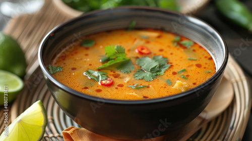 Spicy Thai Tom Yum Soup with Lime and Cilantro Garnish in Black Bowl