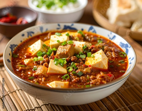 Spicy tofu and meat stew in a bowl, garnished with green onions, served with rice and bread