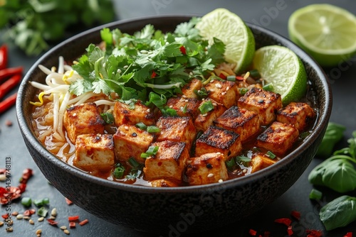 soup, tofu, noodle, spicey, lime, cilantro, asian, food, vegetarian, vegan, chili, bowl, healthy, dinner, lunch, receipe, cooking, cookery, delicious, tasty, hot, fresh, meal, ingredient, eatery, eat, comfort, favor, texture, appetising, aromatic, satisfying, vibrant, colourful, photo, stock, image, gastronomy, culinary, plate, dark, background, closeup, oriental