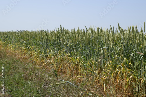 field, wheat, ear, rural, village, green, greener, background, grass, plant, bread, grain, stem, leaf, fertilizer, ripening, summer, agricultural, agriculture, cereal, crop, cultivated, environment, farm, farming, growth, land, yellow, cloud, texture, foliage, nature, fertility, lawn, plain, lea, countryside, landscape, floral, spikelet, spike, summer, concept, scenic, husbandry, leaf