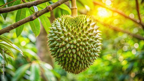 Spiky durian fruit on tree surrounded by vibrant green leaves, durian, tropical, exotic, thorny, tree, green, fruit, spiky