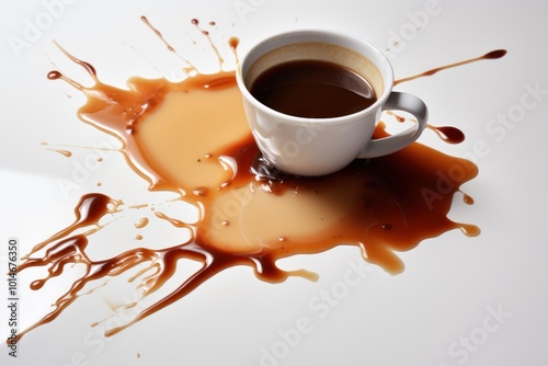 Spilled coffee cup on the table on a white background show haste