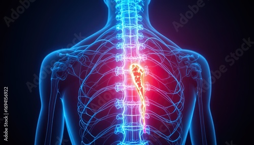 Spinal cord injury highlighted in glowing orange on human anatomy back with blue skeleton and nerves