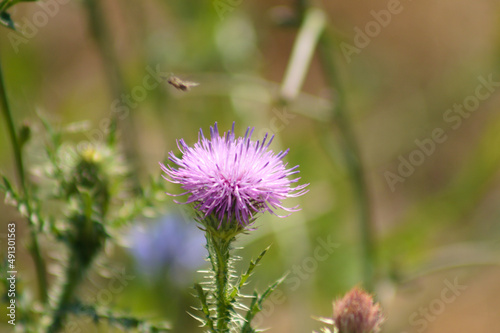 Spiny plumeless thistle flower closeup view with selective focus on foreground