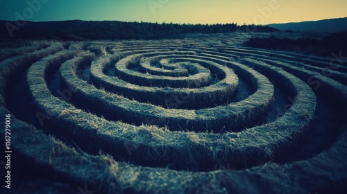 labyrinth, hay, field, spiral, agriculture, farm, rural, pattern, design, countryside, texture, nature, crop, grass, land, path, summer, autumn, dusk, evening, twilight, landscape, nobody, curve, shape, formation, aerial, ground, horizon, scene, environment, growth, wheat, plant, farming, bale, yellow, structure, up high, perspective, huge, open, wide, calm, peaceful, tranquil, quiet, scenic