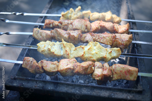 close, up, coal, grill, hot, meat, piece, up high, bar-b-q, brazier, broiling, burnt, cooking, crust, dinner, fire, flames, food, gold, epicure, grilled, heat, holiday, large, lay, lunch, metal, nature, nobody, outdoors, party, pepper, picnic, pork meat, preparation, press, shashlik, slice, smoke, smoked, spring, temperature, view