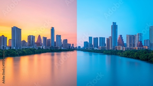 Split image of city skyline at sunrise and sunset, reflected in calm water.