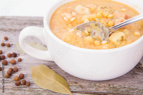 Split pea soup, decorated with some bay leaves, marjoram and peas