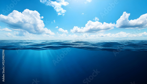 Split view horizon of blue sky with clouds and deep blue underwater ocean. Breathtaking Oceanic Panorama - with copy space to insert ads
