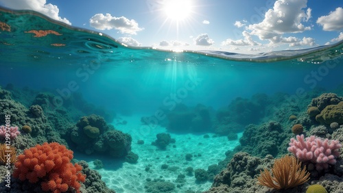 Split view of a coral reef affected by bleaching under a bright sunlit sky