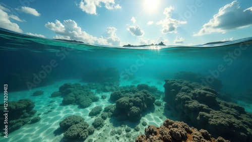 Split view of underwater coral reef and coastal landscape with mountains under cloudy blue sky