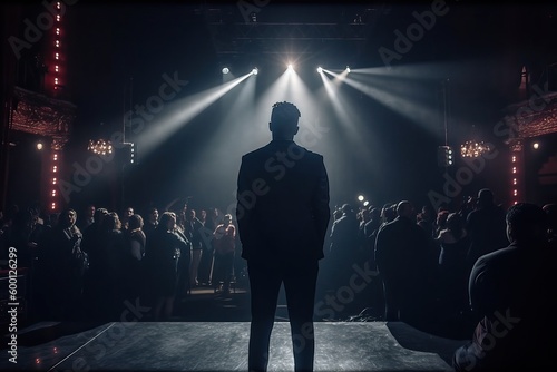 speech, business, lecture, conference, auditorium, speaker, audience, hall, entrepreneur, man, corporate, forum, people, event, public, male, group, businessman, presentation, seminar, stage, presenter, talk, manager, teaching, coaching, professional, congress, background, speak, spokesman, suit, crowded, spotlight, copy space, generative, ai