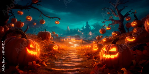 spooky and atmospheric Halloween background with a pumpkin patch, flickering lanterns, and a starry night sky. Generative AI