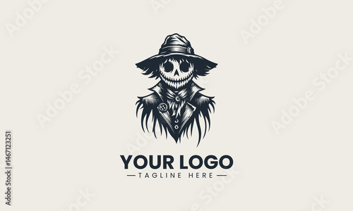 Spooky black and white vector illustration of grinning scarecrow wearing buttoned coat and wide hat