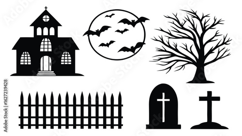 halloween, silhouette, vector, black, illustration, icon, set, design, skittish, creepy, bat, moon, church, tree, fence, grave, gravestone, cross, cemetery, holiday, scarey, night, october, element, graphic, art, clip art, decoration, isolated, cemetery, dark