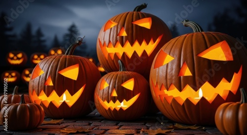 Spooky carved jackolanterns glowing with candlelight on a dark, eerie night