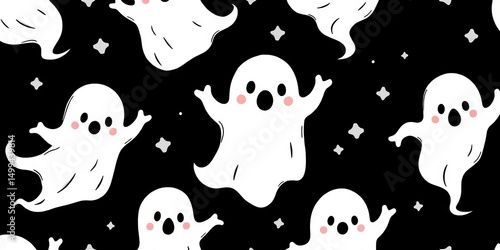 Spooky cute doodle ghost seamless pattern Black and white fantasy background ideal for coloring, wrapping paper, fabric, and textile prints, seamless, ethereal