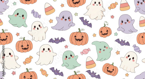 Spooky Cute Kids Pastel Halloween Seamless Pattern with Kawaii Ghosts, Pumpkins, Bats, Candy Corn Background