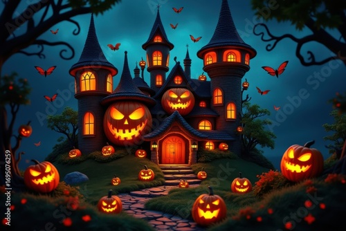 Spooky halloween castle with glowing jack o lanterns at night
